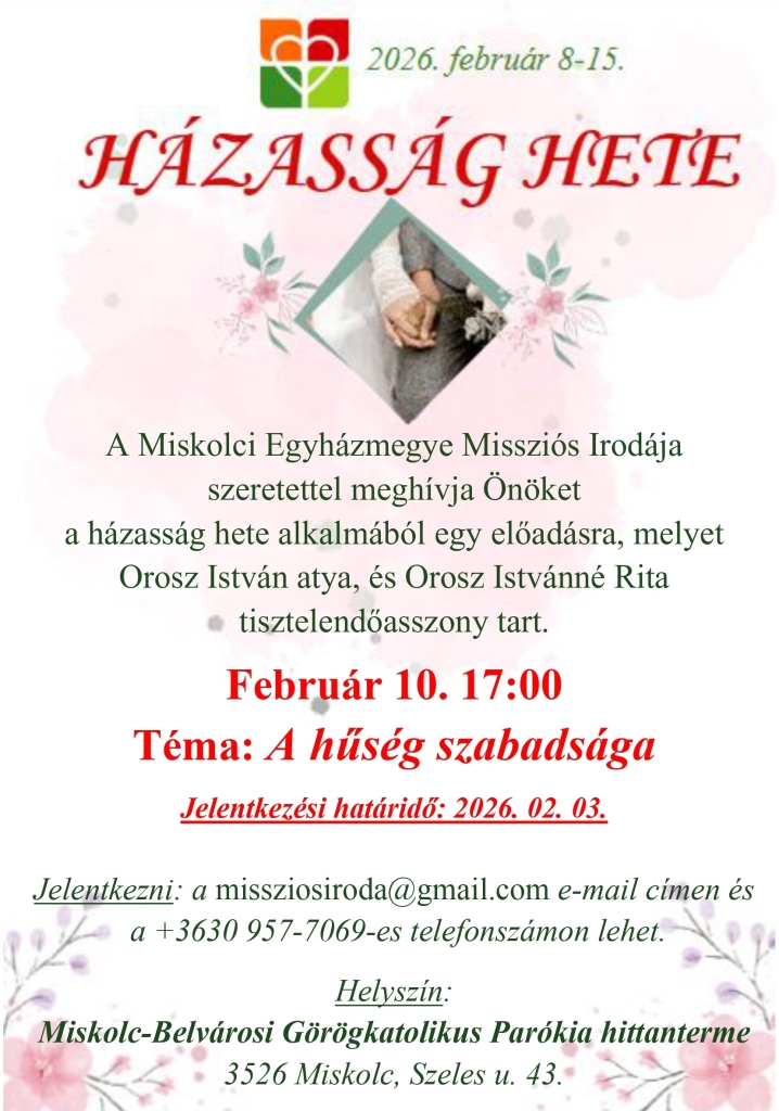 A Miskolci Egyházmegye szervezésében „A hűség szabadsága” című előadás, 2026. február 10-én 17 órától kerül megrendezésre,melyet Orosz István atya és Orosz Istvánné Rita tisztelendőasszony tart.