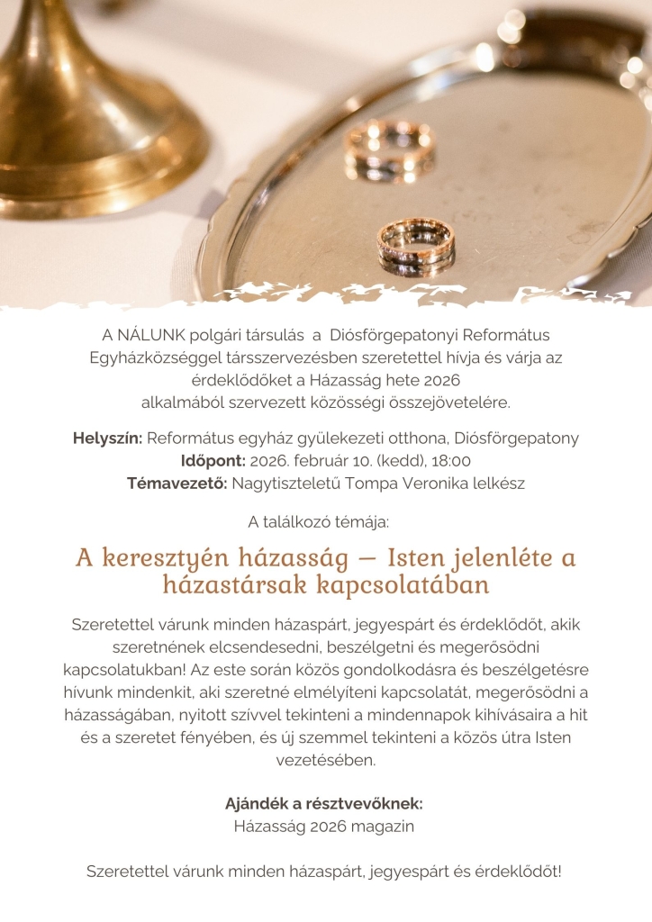Szeretettel várunk minden házaspárt, jegyespárt és érdeklődőt, akik szeretnének elcsendesedni, beszélgetni és megerősödni kapcsolatukban!