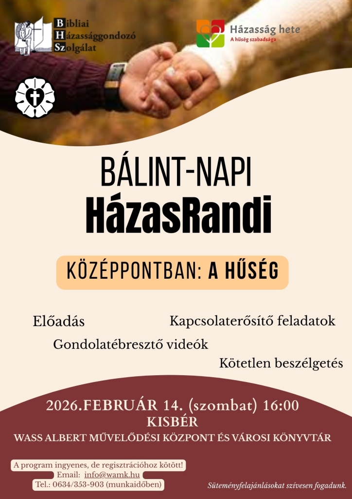 A Bálint napi HázasRandi alkalmával a Bibliai Házassággondozó Szolgálat (BHSZ) munkatársai előadását követően kepcsolaterősítő feladatokat hajtunk végre, melynek középponti témája a HŰSÉG. Gondolatébresztő videó megtekintését követően kötetlen beszélgetésre nyílik lehetőség.