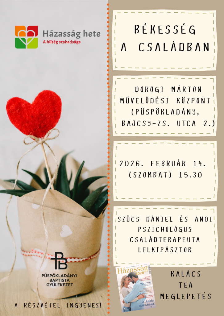 Rohanó világunkban egyre kevésbé találjuk meg az egyensúlyt a családi élet és egyéb elfoglaltságaink között. Stresszes életünk kihatással van a családi/ házastársi kapcsolatainkra is. Hogyan tudjunk a hétköznapokban megtalálni és megtartani a békességet, amire úgy vágyunk? Ebben ad eligazítást a házasság hete alkalmából szervezett előadásunk, amelynek végén kötetlen beszélgetésre, személyes kérdések megválaszolására is lehetőség nyílik.
