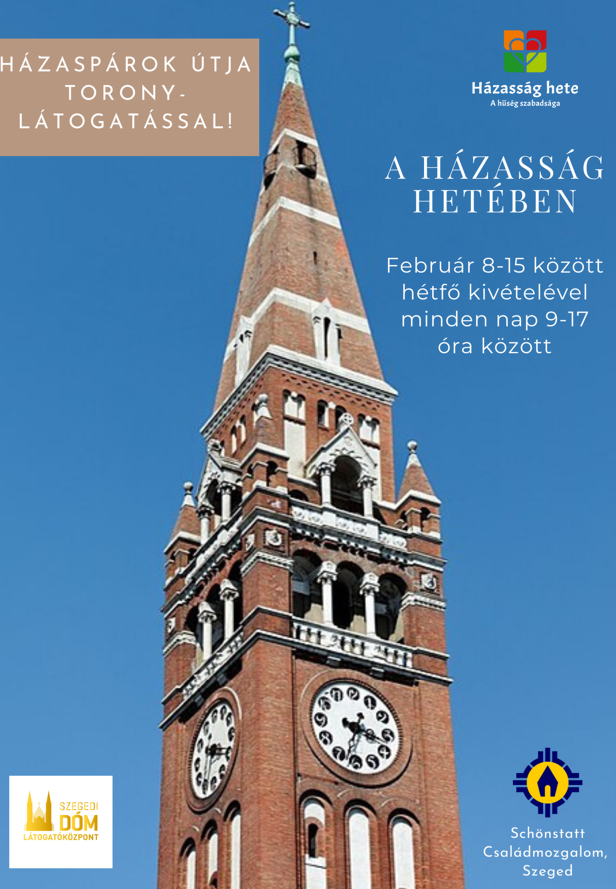 Szeretettel hívjuk a házaspárokat a házasság hete alkalmából egy közös sétára a szegedi Fogadalmi Templomba! Az útvonal érdekessége, hogy nem csak a házasságunk, hanem a dóm magasságaiba is belátást nyerhetünk! A Schönstatt Családmozgalom és a Szegedi Dóm Látogatóközpont közös szervezésében a dóm toronylátogatása közben tudják a házaspárok végig járni a 15 állomásból álló Házaspárok útját.