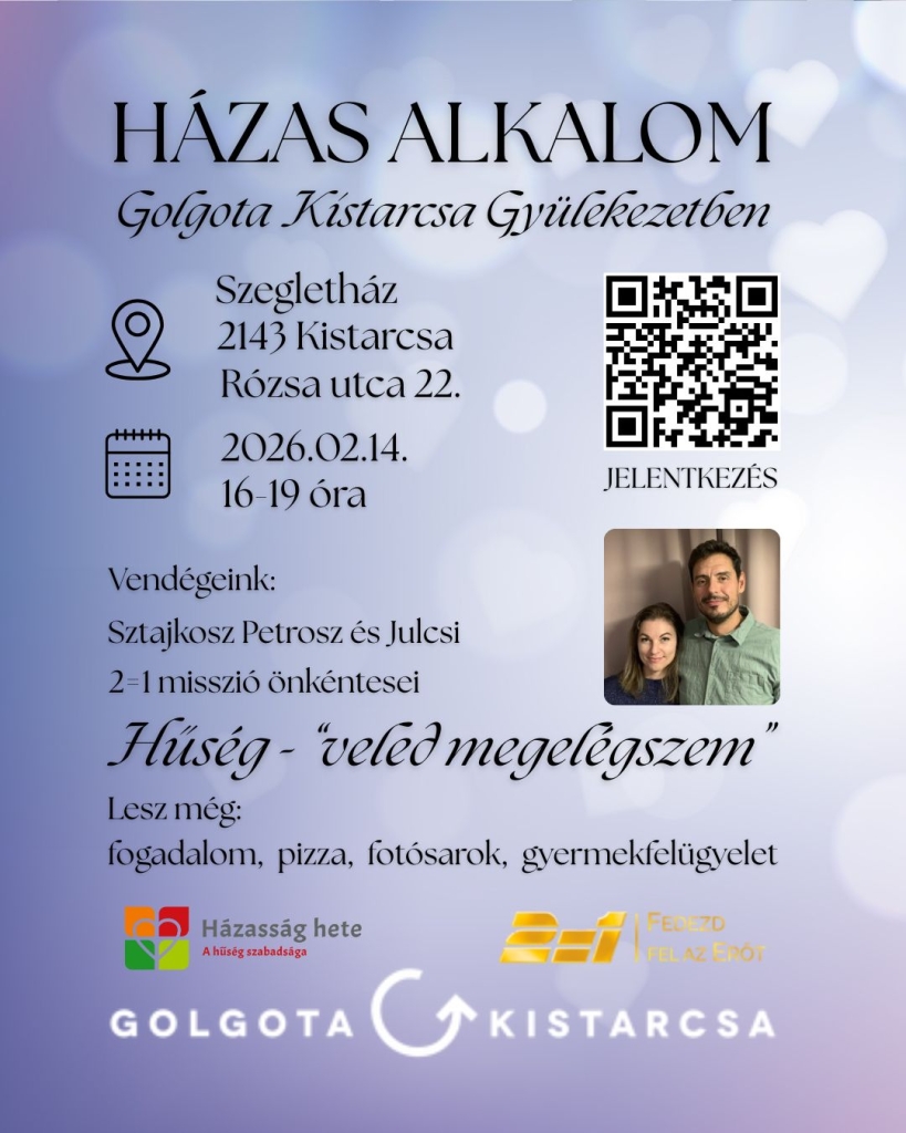 Szeretettel várunk Titeket a Golgota Kistarcsa Gyülekezet nevében, a Házasság Hetének szombatján, egy nagyszerű, házaspárok számára rendezett eseményen!