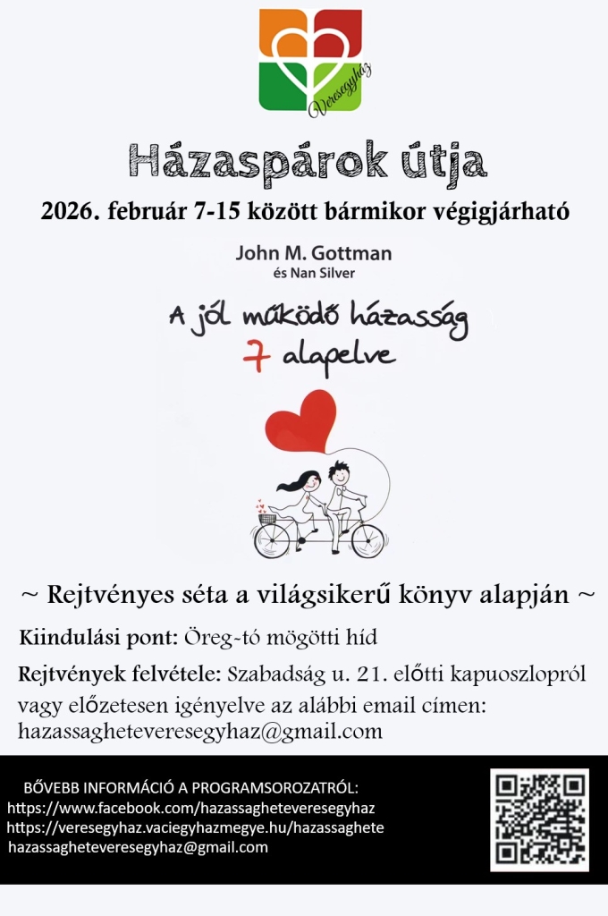 Idén is egy romantikus sétára és rejtvényfejtésre invitálunk Titeket az Öreg-tó körül, elgondolkodtató, megbeszélendő megállókkal. Az állomások idén John M. Gottman és Nan Silver világhírű párkapcsolati könyve alapján – „A jól működő házasság 7 alapelve” – készültek. A séta az Éden étterem melletti kis hídnál indul.