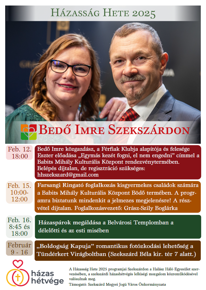 2025. február 12-én szerdán 18 órakor a Babits Mihály Kulturális Központ rendezvénytermében Bedő Imre közgazdásznak, a Férfiak Klubja és a Férfi Nő Akadémia alapítójának, a „Férfienergia”, „A teremtő tűz” és „A megbízható férfi – A férfi-nő szövetség megalapozása és megtartása” c. könyv szerzőjének és feleségének Bedő Eszter közgazdásznak, a Férfiak Klubja programigazgatójanak előadása „Egymás kezét fogni, el nem engedni” címmel.