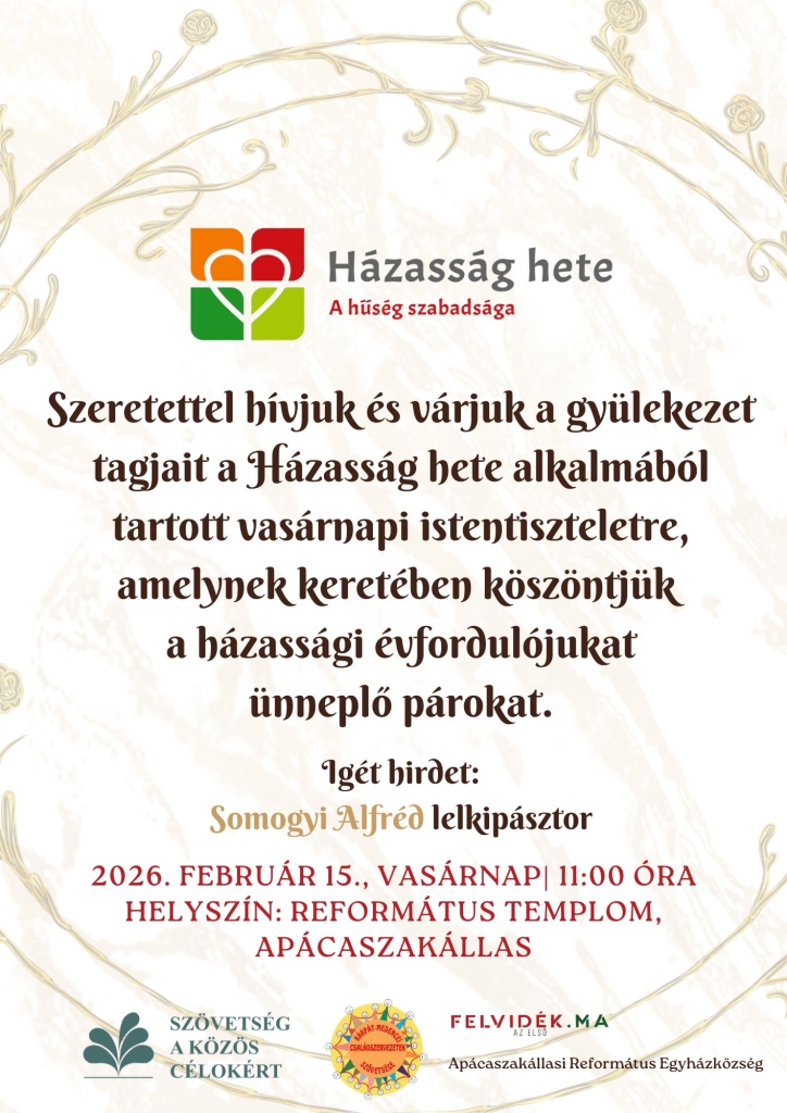 Szeretettel hívjuk és várjuk a gyülekezet tagjait a Házasság hete alkalmából tartott vasárnapi istentiszteletre, ahol külön köszöntjük azokat a párokat, akik házassági évfordulójukat ünneplik. Az igét hirdeti: Somogyi Alfréd lelkipásztor.