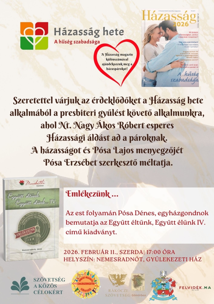 Szeretettel várjuk az érdeklődőket a Házasság hete alkalmából szervezett, a presbiteri gyűlést követő közösségi alkalmunkra Nemesradnóton, február 11-én, szerdán 17.00 órai kezdettel, ahol a házasság értéke, az összetartozás és a közös múlt megbecsülése kerül a középpontba.