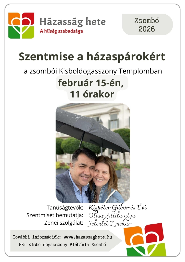 Közösségünk tagjai Kispéter Gábor és Évi tesznek tanúságot arról, hogyan járnak a Gondviseléssel együtt útjukon. A szentmisét Olasz Attila atya, plébánosunk mutatja be, felajánlva közösségünk házaspárjaiért. A zenei szolgálatot a Jelenlét Zenekar látja el.