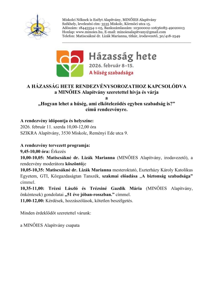 A HÁZASSÁG HETE RENDEZVÉNYSOROZATHOZ KAPCSOLÓDVA a MINŐIES Alapítvány szeretettel hívja és várja a „Hogyan lehet a hűség, ami elköteleződés egyben szabadság is?” című rendezvényre.