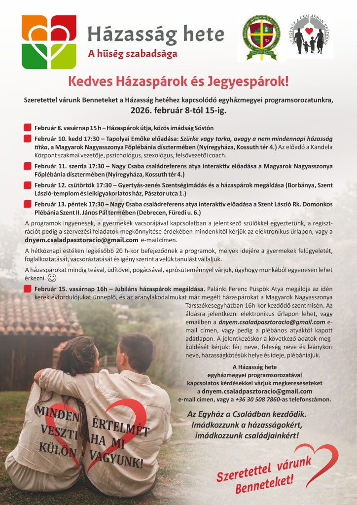 Szeretettel várjuk a házaspárokat egy játékos, interaktív, sok nevetéssel és talán néhány könnycseppel is járó estére, Nagy Csaba családreferens atya elmélkedésével és játékvezetésével. Gyülekezés 17h-tól, kezdés 17:30-tól. A gyermekek felügyeletét, vacsoráztatását, velük való foglalkozást és igény szerint tanulást a Szent Imre Bébiszitter Osztag segítségével vállaljuk. A program ingyenes, de regisztrációhoz kötött: https://docs.google.com/forms/d/e/1FAIpQLSfsgBJ5kG0ZymfnbL_q0LX9-MSZz_tF8bDZpPho7ArZIF8EzQ/viewform?usp=header . Szeretettel várjuk a házaspárokat!