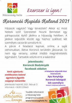 Csapatépítő játékot szervezünk házaspárok és házasodni vágyók részére. 4 feladat érkezik a pároknak, melyet otthonukban vagy Koroncó területén kell végrehajtani. Ez nem egy verseny, a célunk az, hogy a párok egy hétig egymásra figyeljenek, sokat beszélgessenek és kedvességekkel lepjék meg egymást. Mindenki egyéni ütemben haladhat, naphoz, időhöz nem kötöttek a feladatok.
