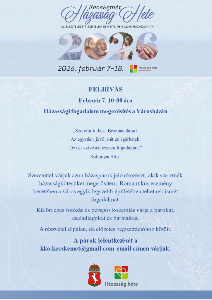 Szeretettel várjuk azon házaspárok jelentkezését, akik szeretnék házasságkötésüket megerősíteni. A Városháza Dísztermében tehetnek ismét fogadalmat. Különleges fotózás és pezsgős koccintás is várja a párokat, családtagokat és barátaikat.