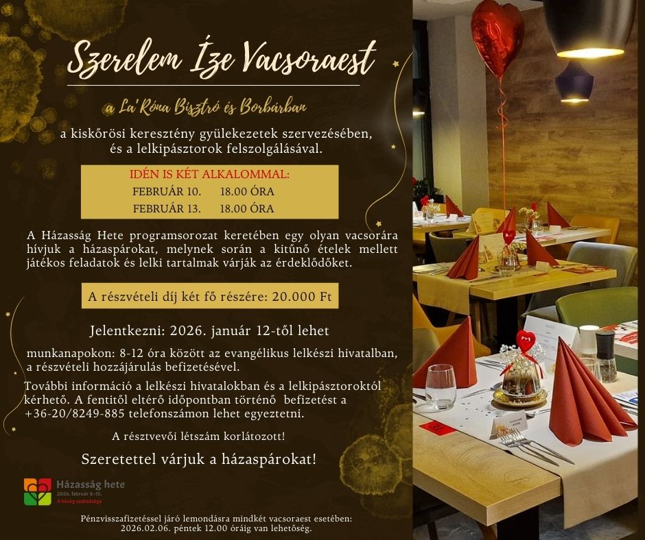 Pénzvisszafizetéssel járó lemondásra mindkét vacsora esetében 2026.02.06 péntek 12:00 óráig van lehetőség.