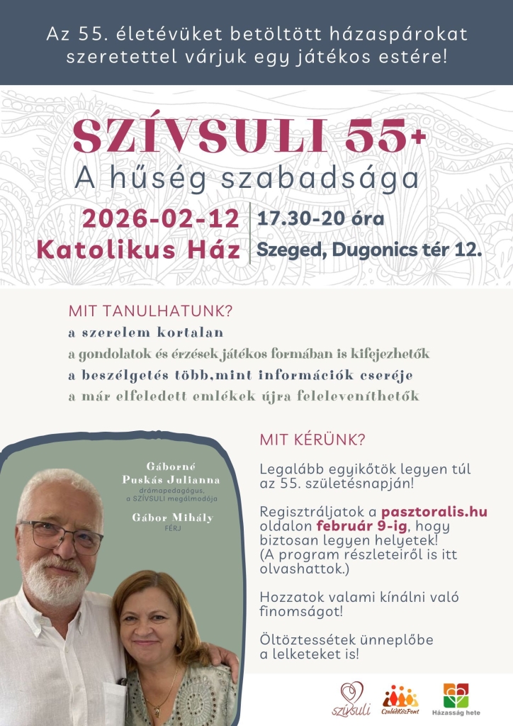 Az 55. életévüket betöltött házaspárokat hívjuk egy olyan estére, ahol a mese, a játék, a beszélgetés segítségével igazi minőségi időt tölthetünk együtt.