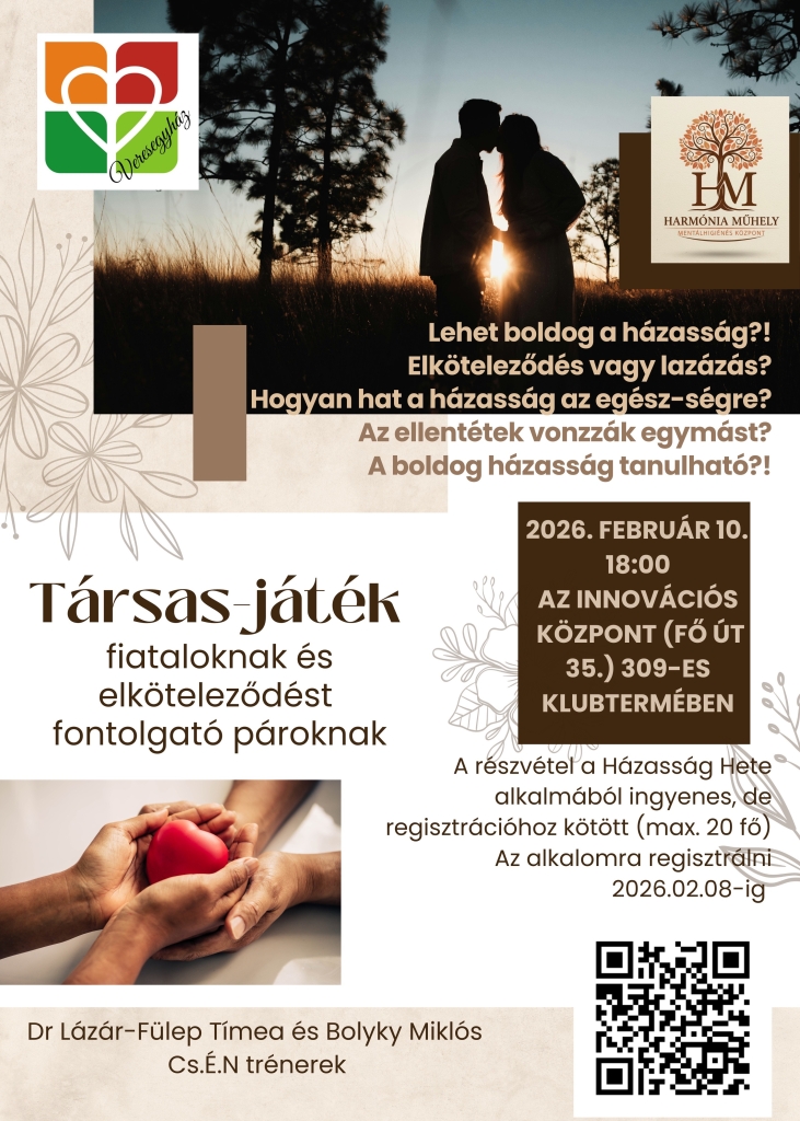 Társas-Játék, interaktív alkalom a Harmónia Műhely szervezésében fiataloknak és házasság előtt álló pároknak a „jó házasságra” készülés jegyében. A CS.É.N terapeuta előadók a fiataloknak, jó házasságra vágyóknak, házasságra készülő pároknak segítséget, irányokat szeretnének mutatni, hogy milyen kérdésekre érdemes válaszokat keresni és milyen módon a párválasztás, együtt járás során annak érdekében, hogy ne a házasságkötés után jöjjenek a meglepetések.